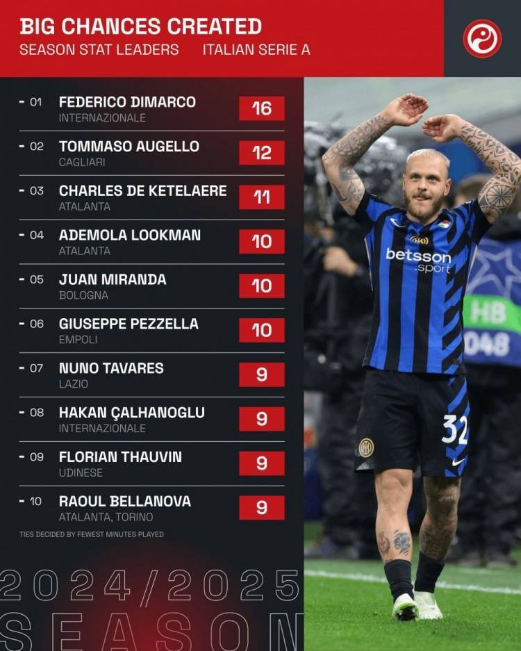直播吧4月23日讯 Squawka统计了意甲球员本赛季联赛创造重大机会的次数,并列出榜单,迪马尔科16次居首。